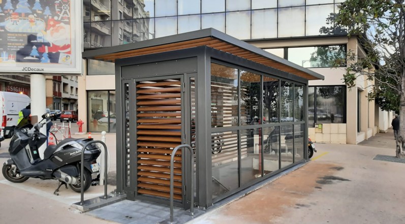 En 2021 Notre client souhaitait sécuriser les sorties de secours du tunnel de Toulon, nous avons donc designé et produit un abri sur mesure en partie vitré avec des ventelles en aluminium thermolaquées effet bois.